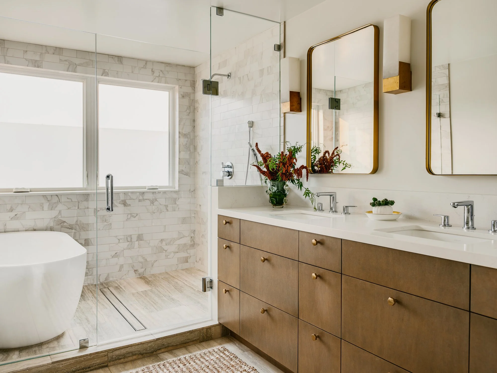 Modern bathroom with a freestanding bathtub between two vanity sinks with mirrors, marble wall accents, black wall sconces, and a large window.