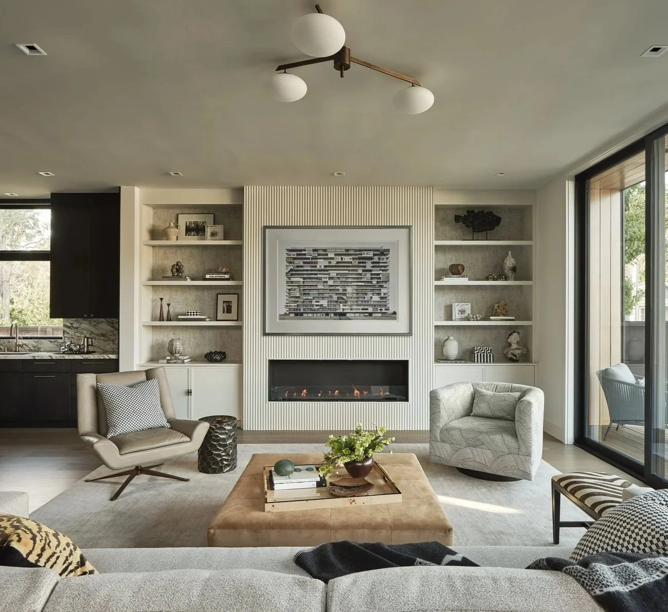 Against a backdrop of expansive glass walls, we brought warmth to this contemporary architecture through a deep-toned kitchen, tactile layers, and thoughtfully placed moments of visual contrast. With the dining room also serving as a glass-enclosed passageway, we introduced a tan suede ceiling and neutral textured wallpaper, creating a soft counterpoint that complements the alabaster and brass light pendant.
